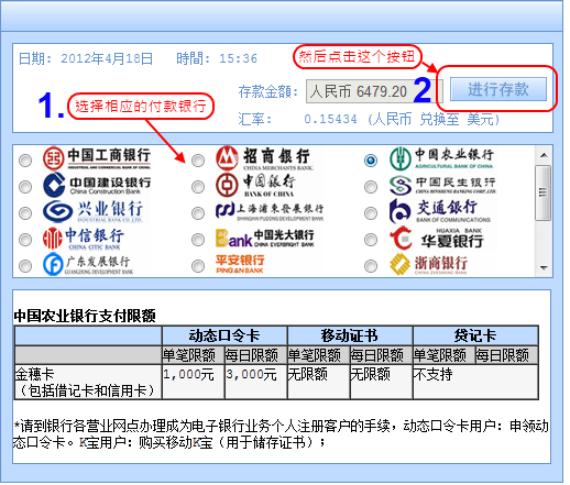 根据左边的图示,选择相应银行后点击“进行存款”,页面会转向到银行网银支付页面,完成付款后等待页面自动返回。 |
